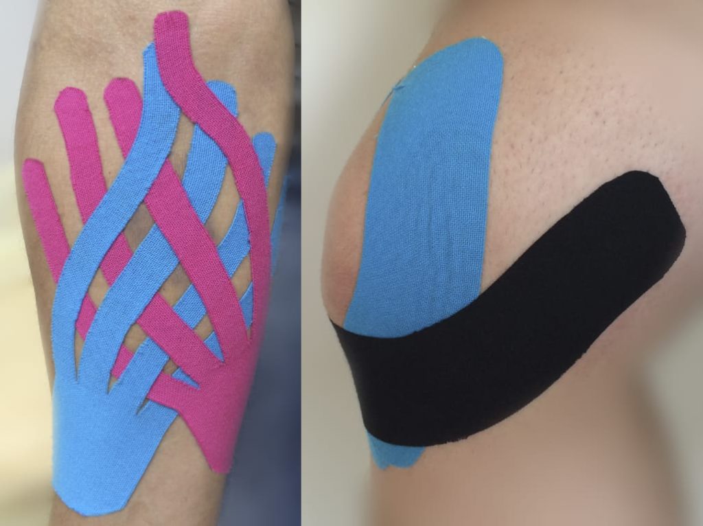 The product is a type of thin, elastic cotton tape that can stretch up to 140% of its original length. As a result, if the tape is applied stretched greater than its normal length, it will “recoil” after being applied and therefore create a pulling force on the skin. This elastic property allows much greater range of motion compared to traditional white athletic tape and can also be left on for long periods before reapplication.